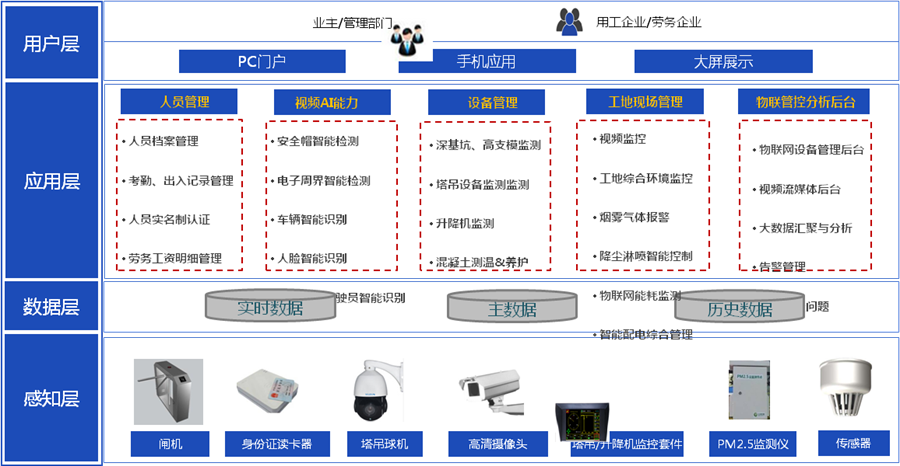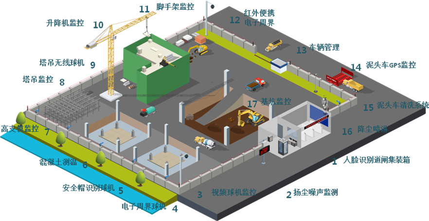 現場管理:視頻監控 、工地綜合環境監控(溫濕度、噪音、PM值等) 、煙霧氣體報警(消防) 、降塵淋噴智能控制 、物聯網能耗監測(水電能耗監測) 、智能配電綜合管理(電力設備安全及用電監控)